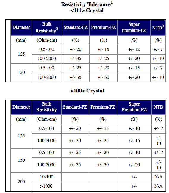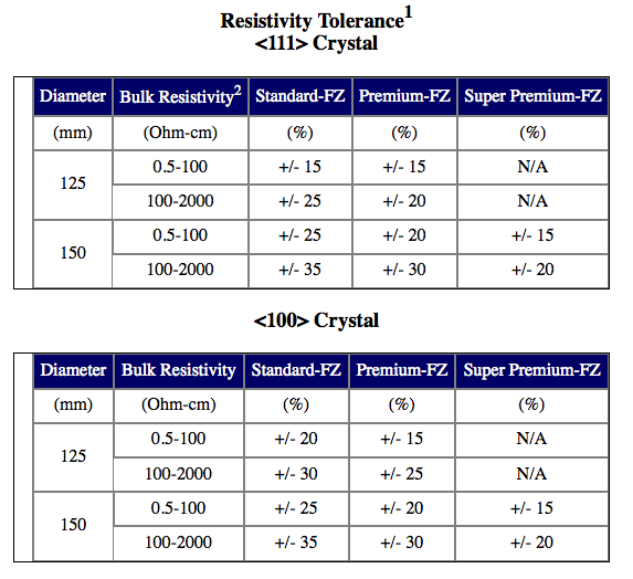 | Resistivity | 0.001 – 100 ohm-cm | |||||